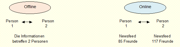 Führen dagegen zwei Personen in einem sozialen Netzwerk dieses Gespräch können die Freunde der jeweiligen Person es durch den Newsfeed, also der Pinnwand des Users verfolgen. So ist das Gespräch oder die Nachricht nicht nur für den gewünschten Gesprächspartner zu sehen sondern auch für alle Freunde. So kann eine Person eventuell das Kaufverhalten vieler Nutzer beeinflussen.